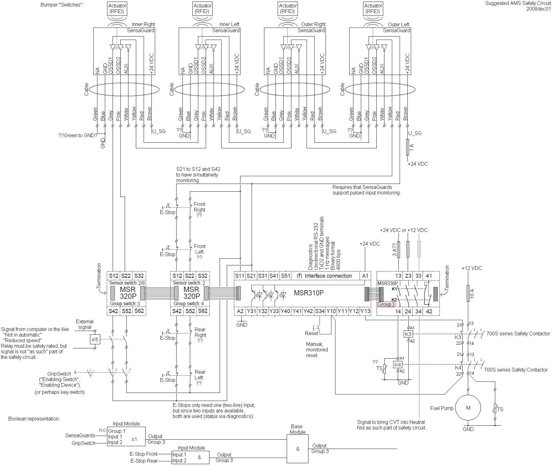 This is how the safety circuit is implemented at the moment. This diagram will be updated when the new wireless e-stop is developed and implemented (approx. november 2011)